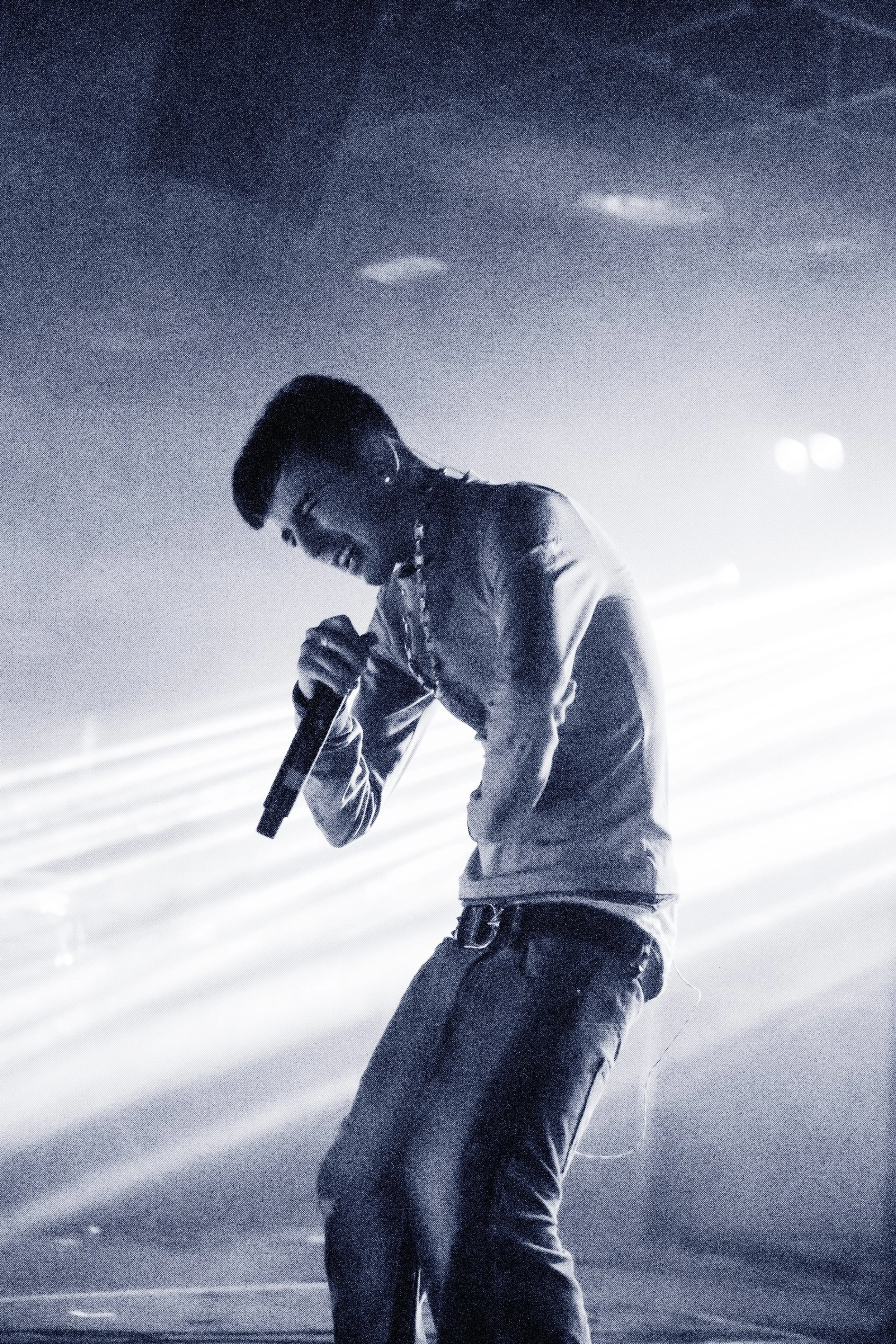 Cantante en concierto con micrófono, con gorro y varios tatuajes en el torso.
