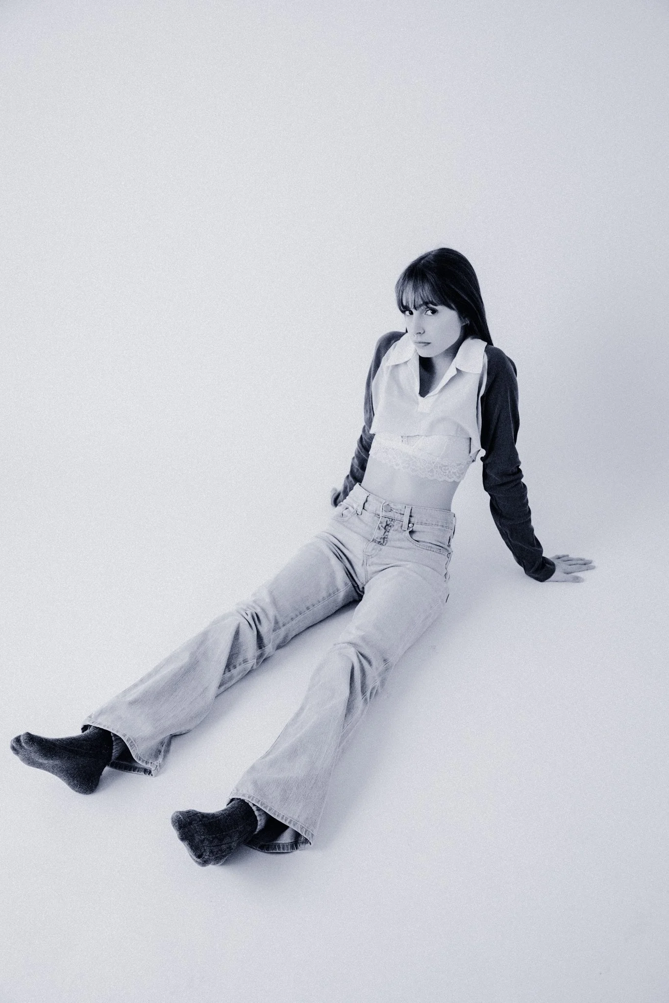Mujer sentada en el suelo con pantalones acampanados, camiseta recortada y calcetines oscuros, en un fondo blanco.
